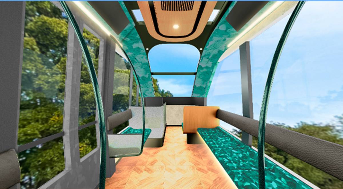 走行方式はジェットコースターと同じ原理を採用。上り勾配はモーター駆動で走るが、下り勾配は条件により位置エネルギーを利用して走る。車両は長さ約21mの3両編成で定員(座席数)は60人。窓からの眺望に優れたデザインを採用する。バリアフリーに配慮し、車椅子やベビーカーでも乗車できるスペースを車内に確保する。